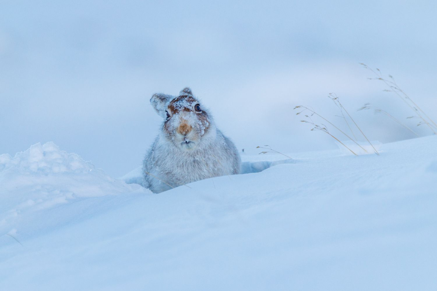 The trek through thick, fresh snowfall was grueling. The wind cut through our layers, making the cold feel even more bitter, and the deep snow made every step an effort. But Karen's dedication to the search never wavered. After a long, demanding hike across the white expanse, we were finally rewarded with something truly special: several hours spent observing and photographing Mountain Hares in their harsh, beautiful environment. Watching these remarkable creatures, perfectly adapted to their unforgiving habitat, made every frozen moment worthwhile.