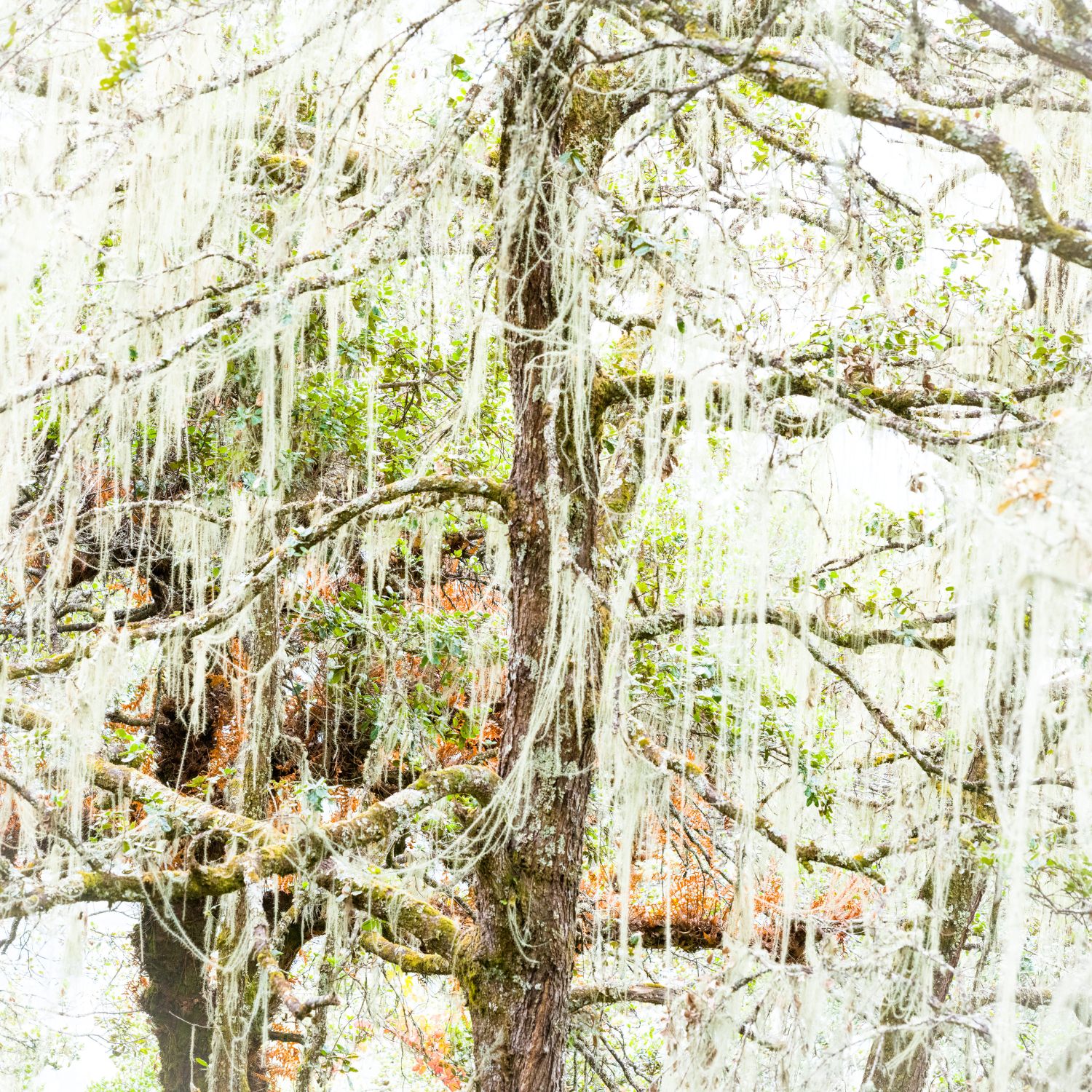 The path wound upward through magnificent blue pine and rhododendron forest, the air crisp and cool in the early morning. What made this climb particularly special for photography was the otherworldly quality of the woodland. Ancient trees were draped with curtains of russet-colored lichen, creating an almost fairy-tale atmosphere. I couldn't resist stopping frequently to capture these abstract compositions – the contrast between the twisted, moss-covered branches, the hanging lichen in burnt orange tones, and the skeletal leaves still clinging to some trees created hauntingly beautiful patterns. These weren't the typical postcard shots of the monastery, but they felt like an essential part of the story of this sacred mountain.