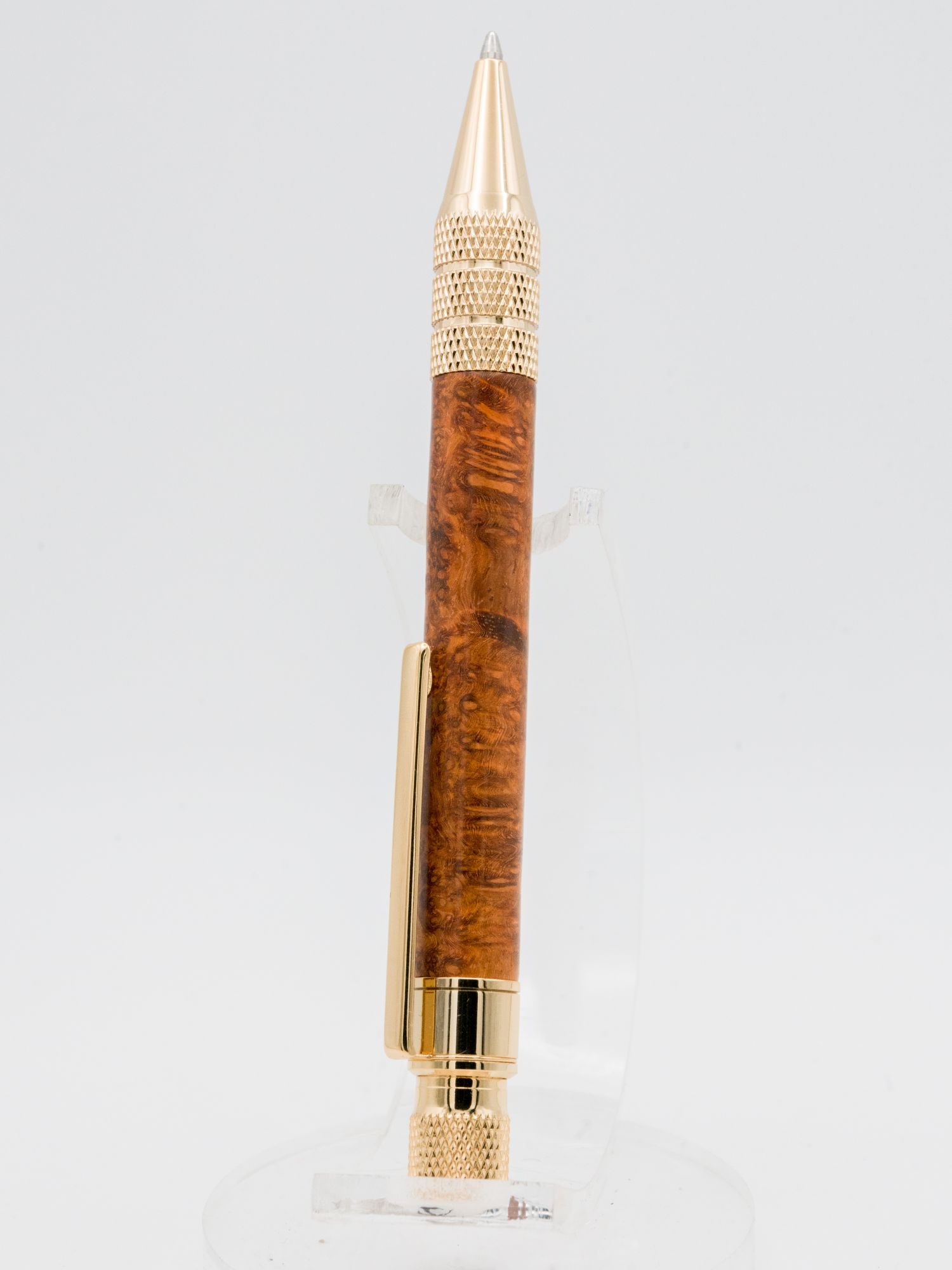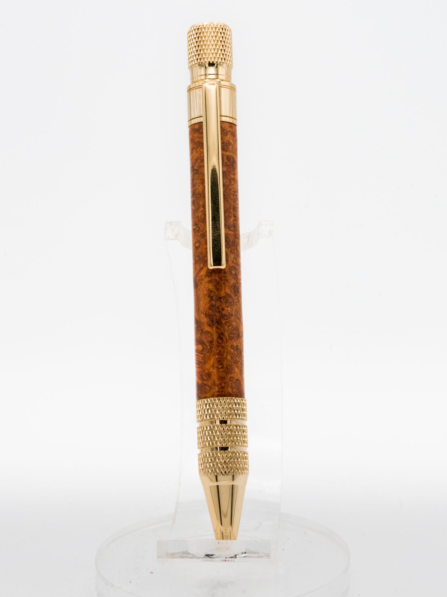 Each pen is hand-turned on the lathe, making it a genuine one-of-a-kind creation. The natural variations in the burl figure and colour ensure no two pieces are identical. The vibrant oranges, reds and deeper brown tones combined with the intricate swirling patterns create a captivating visual appeal with extraordinary depth and complexity, whilst the luxurious gold-plated fittings provide both elegance and style.