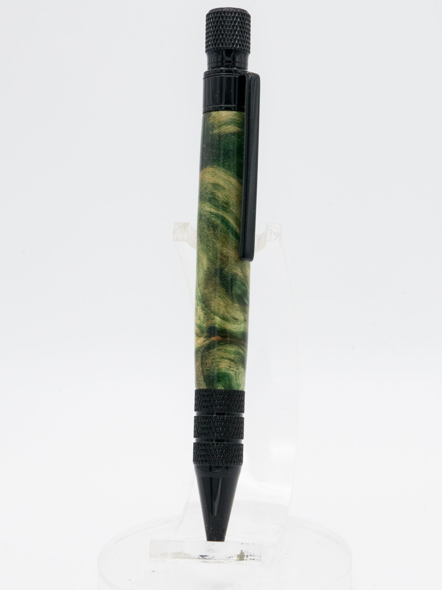 Poplar burl features distinctive burly grain patterns with intricate figuring created by natural growth formations. When enhanced with green dye, the wood takes on vibrant colouration that accentuates its complex grain structure. The dyeing process penetrates the porous burl wood, creating stunning colour variations and highlighting the unique patterns, making each pen truly special.