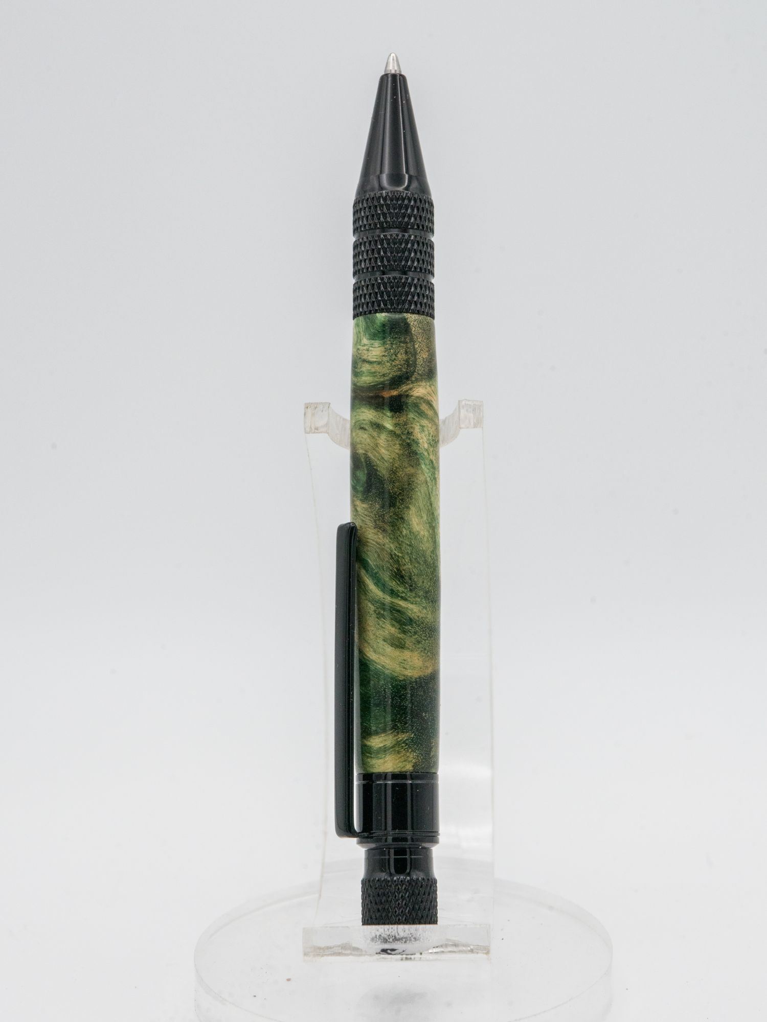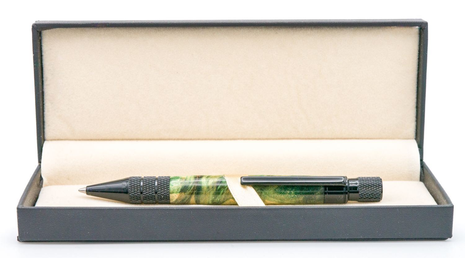 Each pen is hand-turned on the lathe, making it a genuine one-of-a-kind creation. The natural variations in the burl figure and dye absorption ensure no two pieces are identical. The rich green tones combined with the complex, swirling burl patterns create a captivating visual appeal with remarkable depth and character, whilst the quality fittings provide both durability and style.