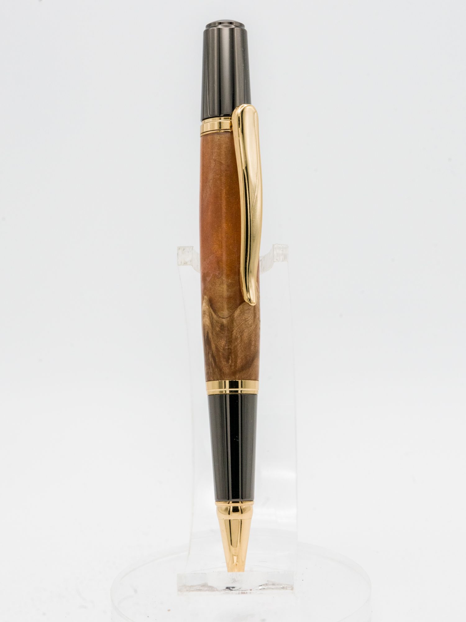 A stunning writing instrument hand-turned to showcase exceptional natural beauty and modern craftsmanship. This ballpoint pen features a mesmerising barrel crafted from stabilised mallee burl paired with complementary resin, creating a striking contrast between organic wood and contemporary materials that results in a truly one-of-a-kind piece.
