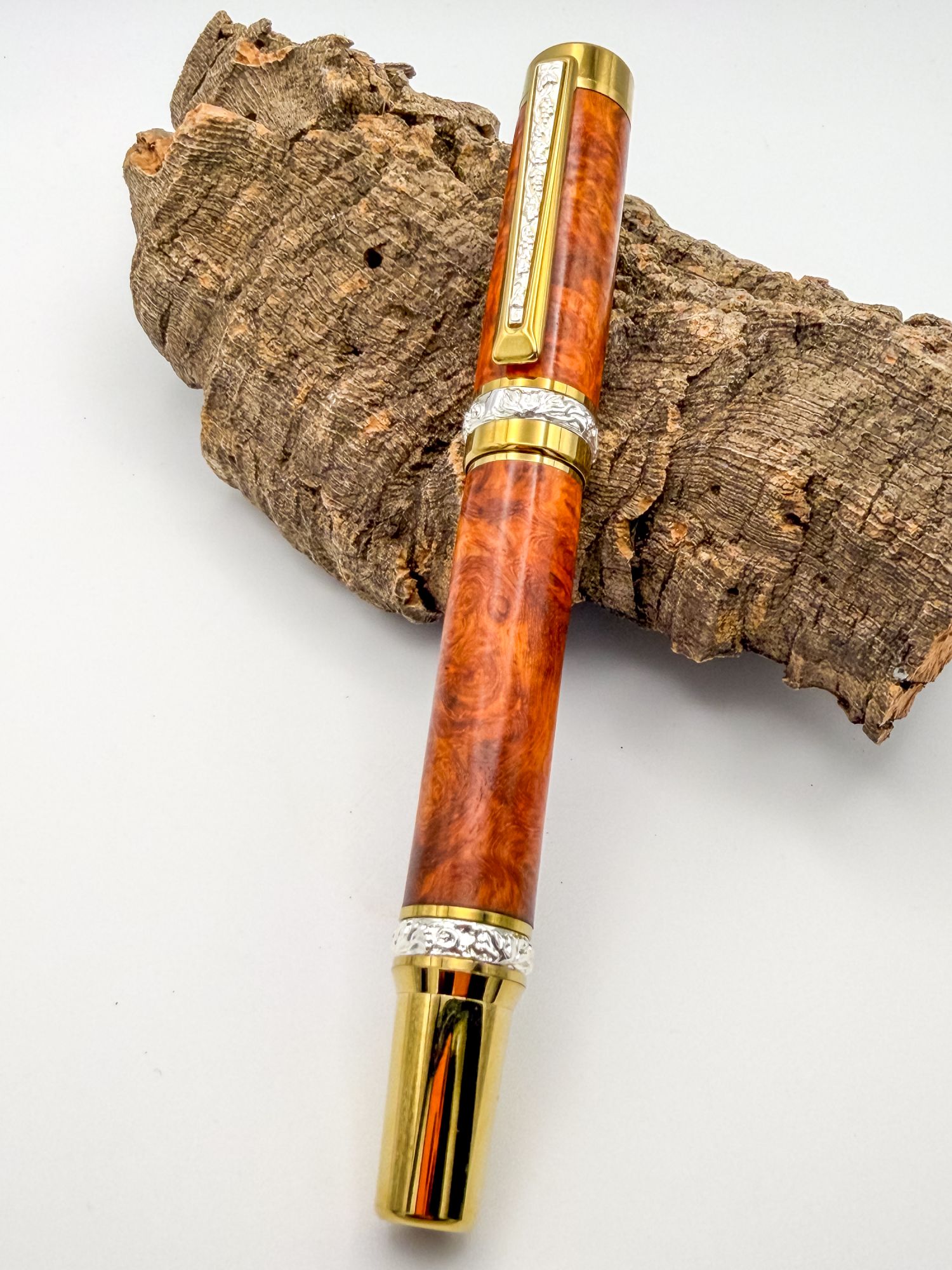 The kit matches it beautifully. Sterling silver plate throughout, with lavishly engraved decorative bands top and bottom — intricate floral scrollwork that gives the whole pen a distinctly heirloom quality — finished with warm gold accents that pick up the amber tones in the burl and tie the whole composition together. The silver clip panel on the cap adds another layer of elegance, and the beautifully engraved gold nib is exactly the finishing touch a pen like this deserves.