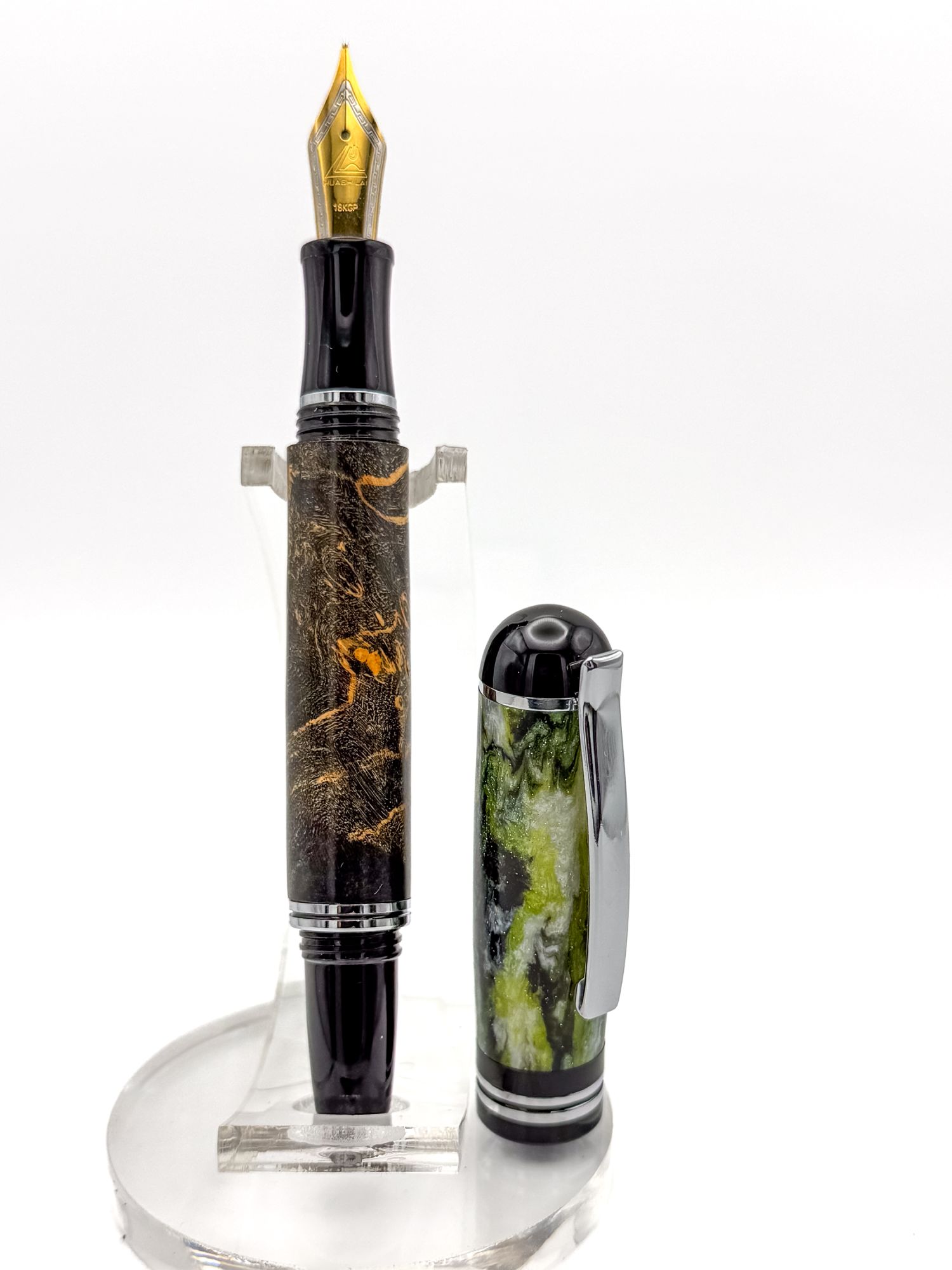 The cap is where things get really interesting. A hand-cast dual core resin in deep forest green, black and white — swirling and layered in a way that somehow manages to feel both wild and perfectly balanced alongside the burl body. The contrast between the organic warmth of the wood and the cool, glittering depth of the resin is striking without feeling like a mismatch. They were made for each other, even if nature and chemistry had to collaborate to make it happen.