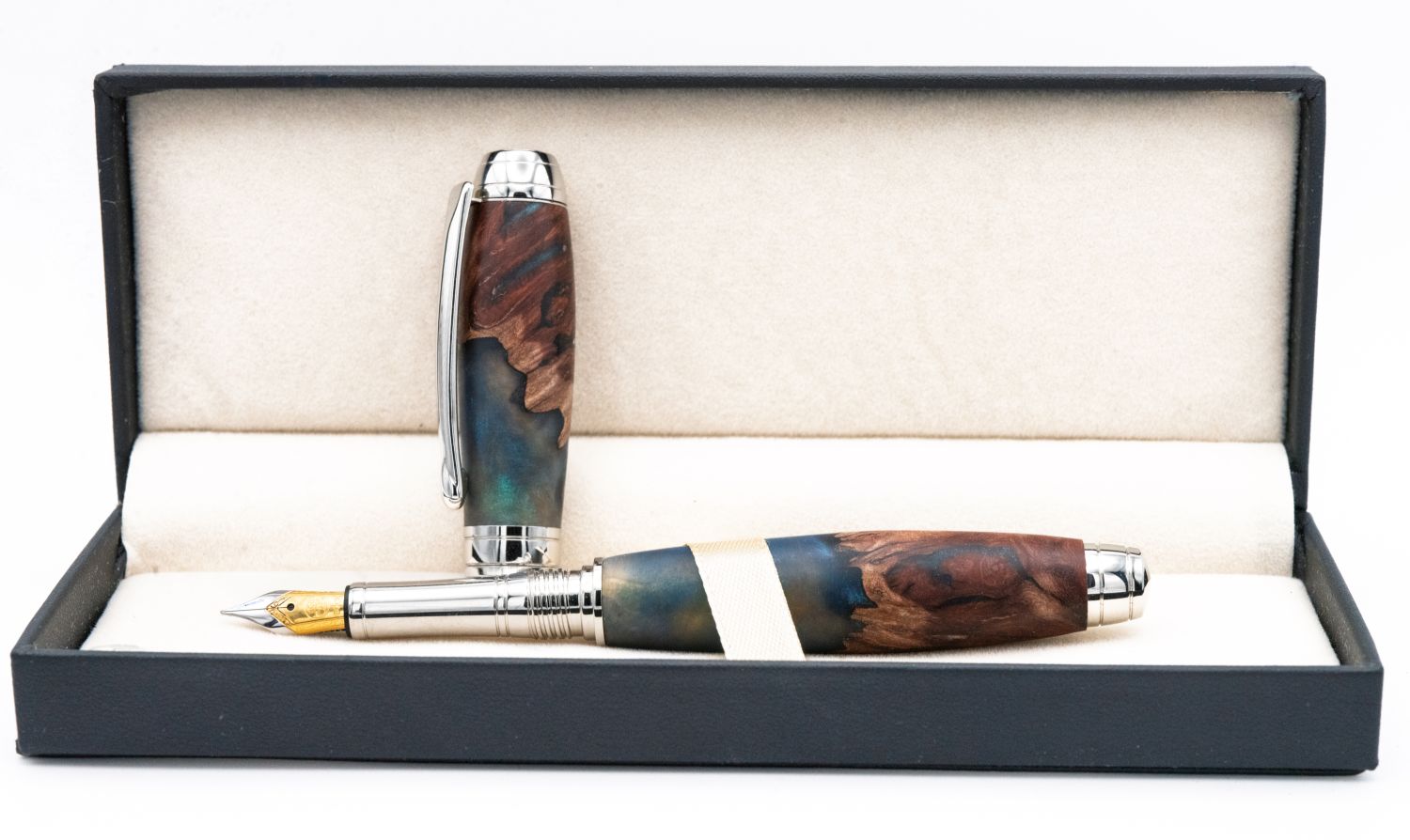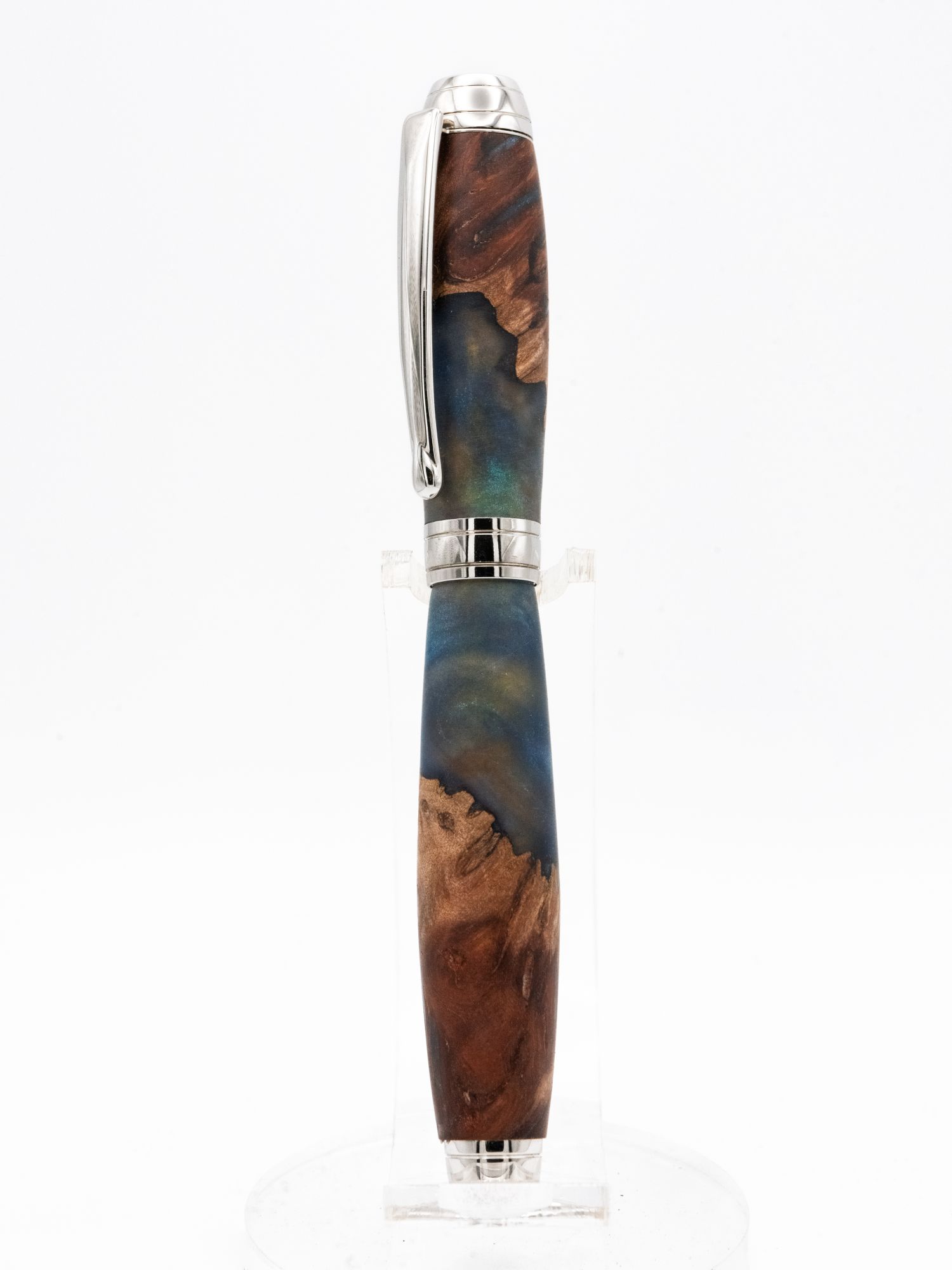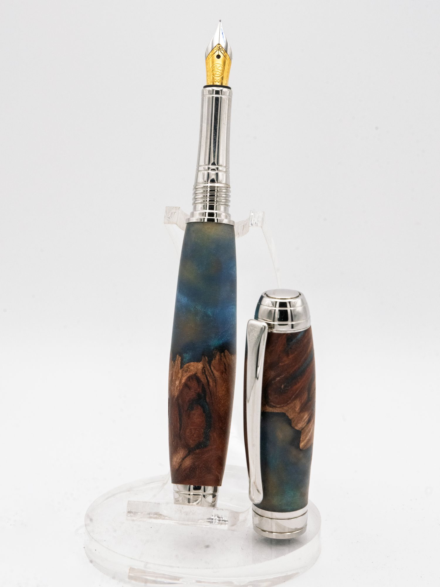 A stunning writing instrument hand-turned to showcase exceptional craftsmanship and natural beauty. This fountain pen features a captivating barrel crafted from rare Mallee burl, revealing the wood's rich, dramatic grain patterns beautifully contrasted with deep teal and blue resin inlays that evoke an oceanic depth and create a truly unique piece.