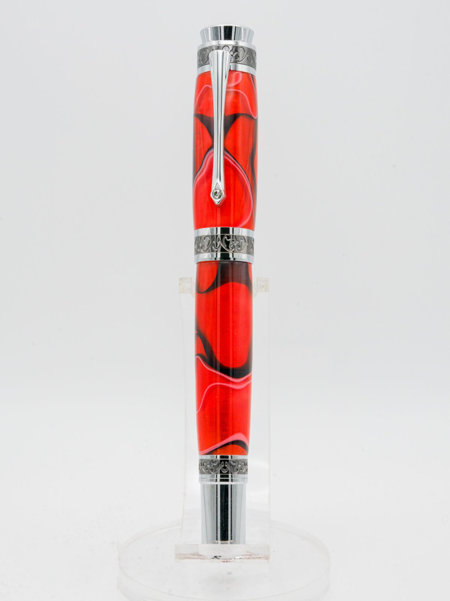 Each pen is hand-turned on the lathe, making it a genuine one-of-a-kind creation. The natural variations in the resin pattern ensure no two pieces are identical. The contrast between the bold red and black swirls creates a striking visual appeal, while the quality chrome fittings provide both durability and style.