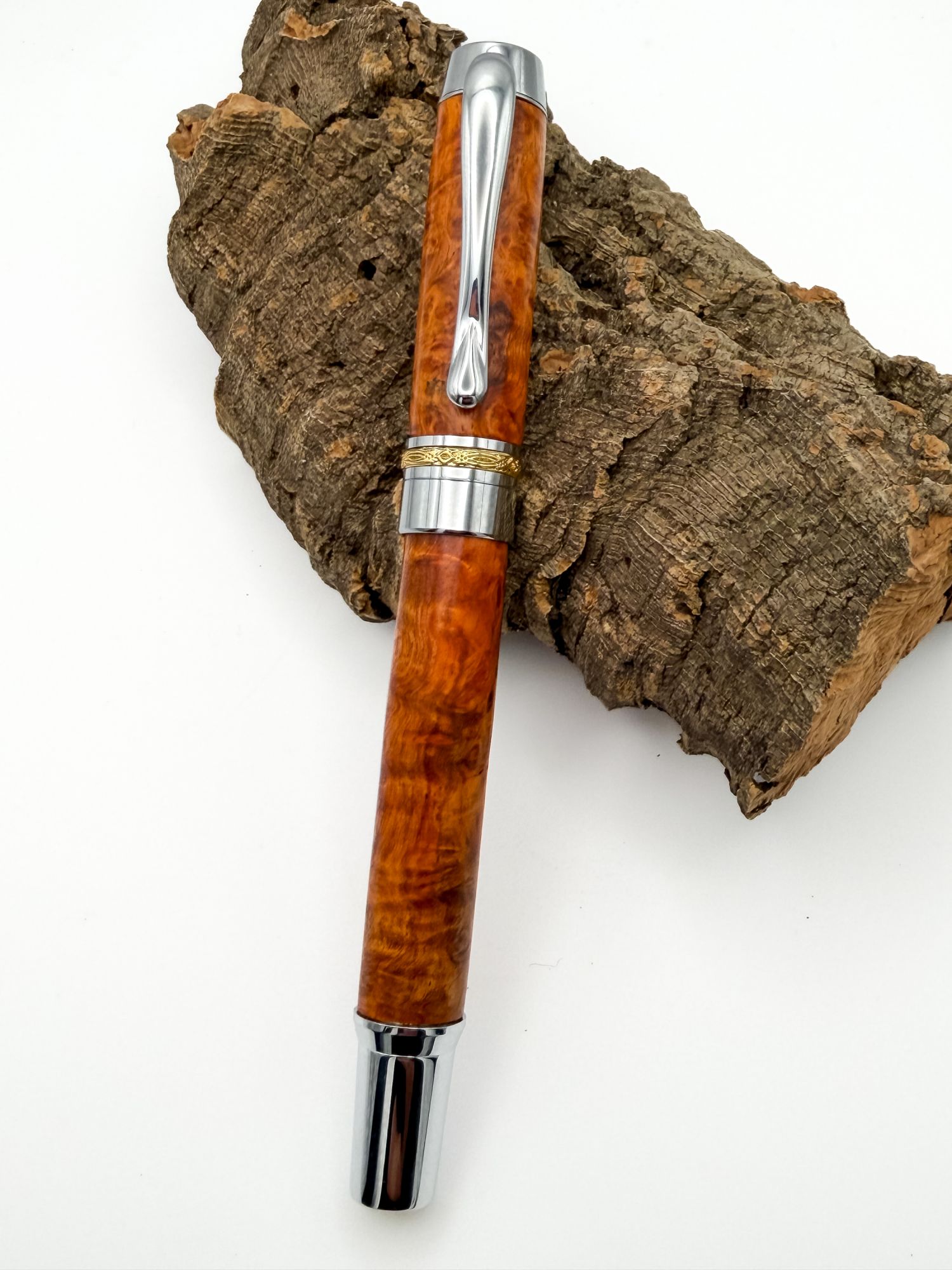 The Kenilworth II is a larger, more substantial pen — satisfying to hold, with a proper presence in the hand — and that generous barrel gives the burl room to really perform. Chrome fittings keep things clean and contemporary, with a fine gold engraved band at the centre adding a quiet touch of luxury without overdoing it. The cap finial carries an ornate gold medallion detail that echoes that warmth beautifully.
