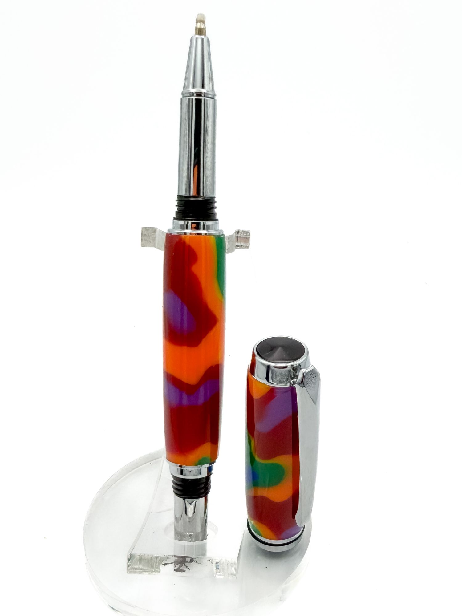 If you thought camouflage was supposed to help you blend in, Kirinite's Carnival Cammo clearly didn't get the memo. This is camouflage that absolutely refuses to hide — great sweeping waves of flame orange, forest green, deep crimson, purple and yellow all tumbling over each other in a pattern that shifts and changes with every rotation of the pen. It's loud, it's joyful, and it's completely impossible to ignore.