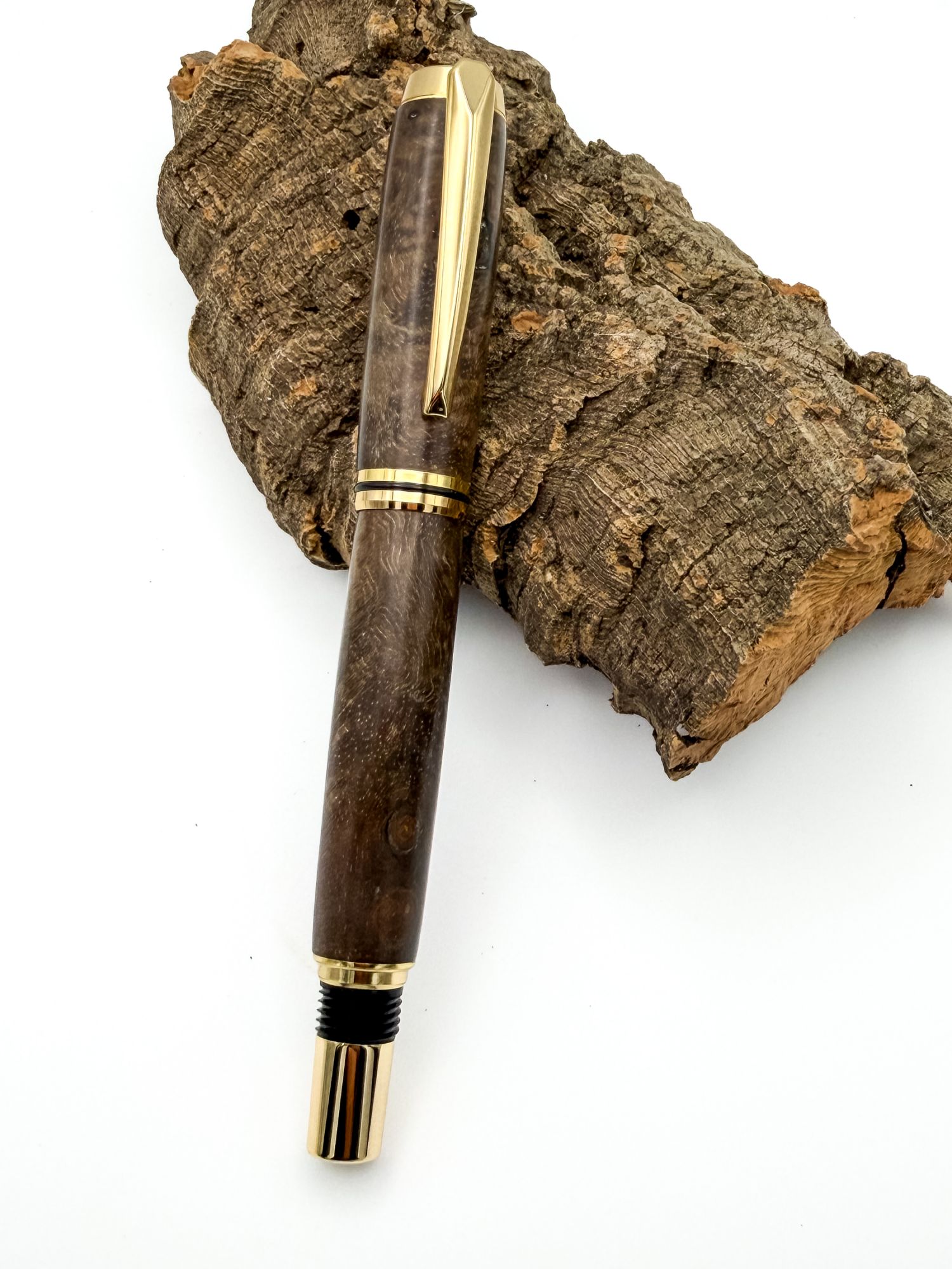 The Kenilworth II's larger format suits it perfectly — there's enough barrel to let that grain breathe and tell its story, and the warm 24ct gold plated fittings complement the natural tones of the wood beautifully rather than competing with them. The faceted gold cap catches the light with clean, angular confidence, and the black accent rings at barrel and nib add a sharp, considered contrast that stops the whole thing from looking too conventional.