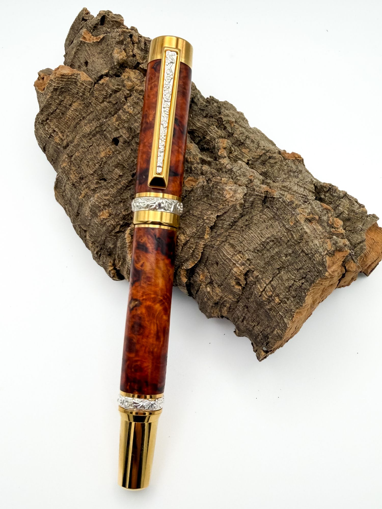 The Lapworth II is already a pen with serious presence — larger, bolder, the kind of thing that commands a desk rather than just sitting on one. But this particular example takes things to another level entirely, pairing a deeply figured Amboyna Burl body with hand-engraved sterling silver panels and accents that are genuinely breathtaking up close.