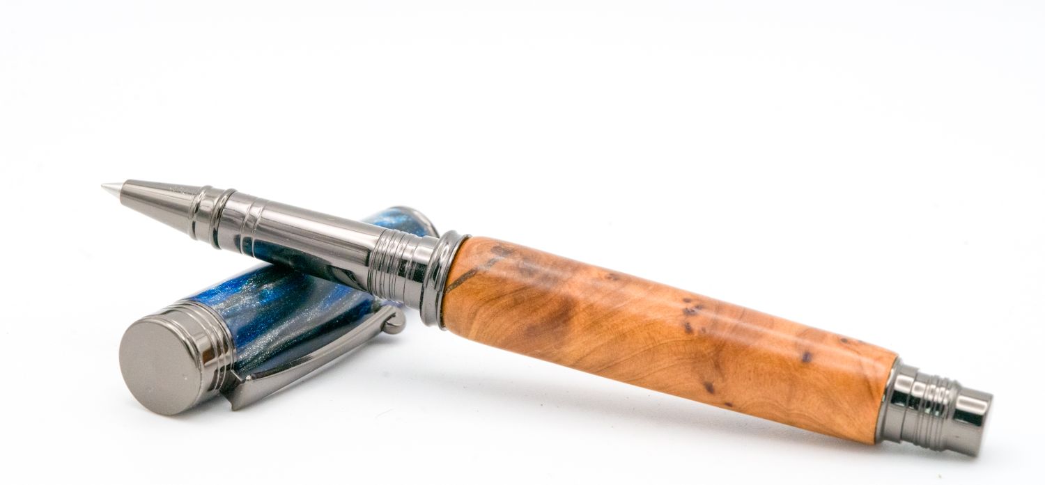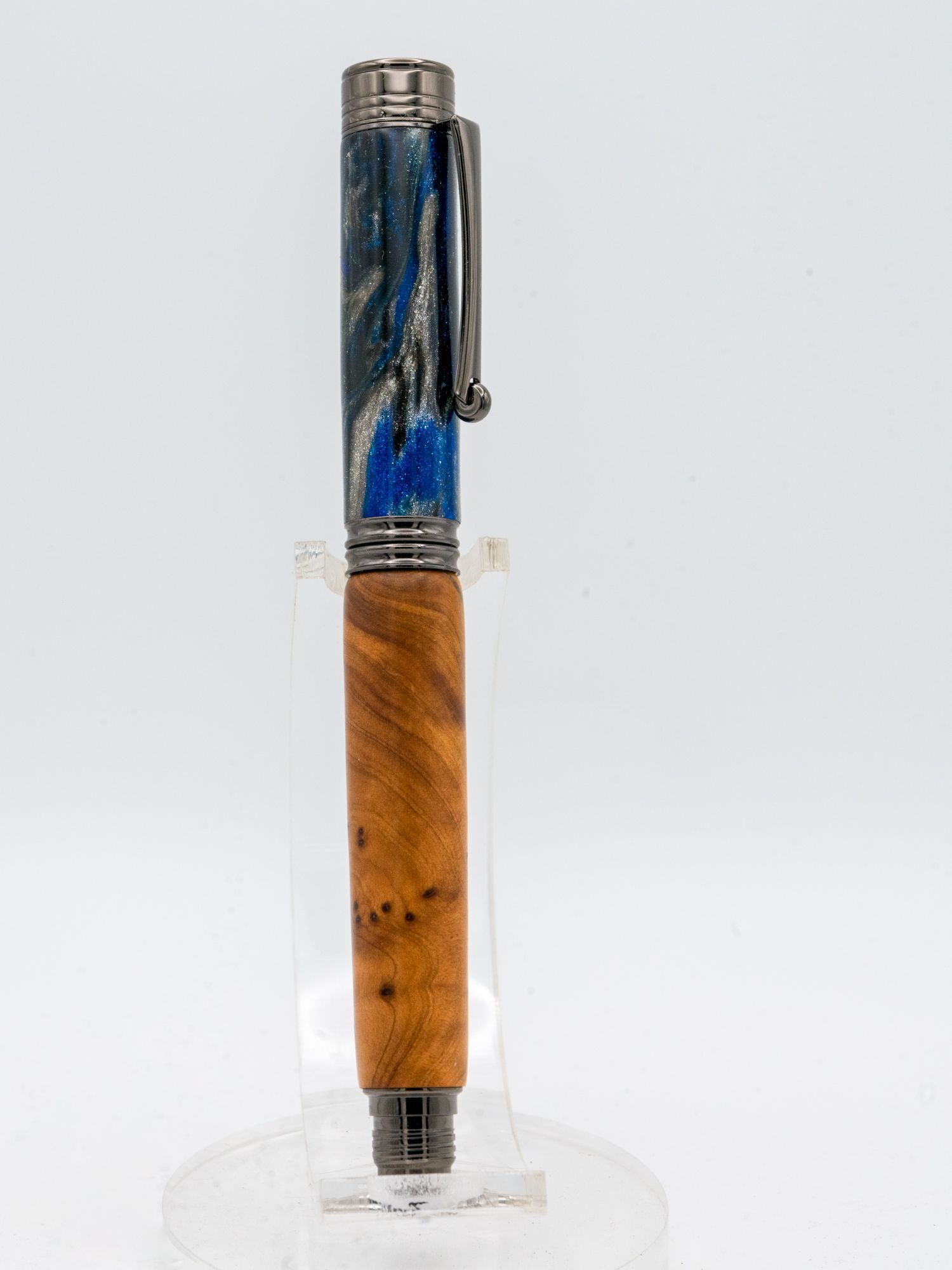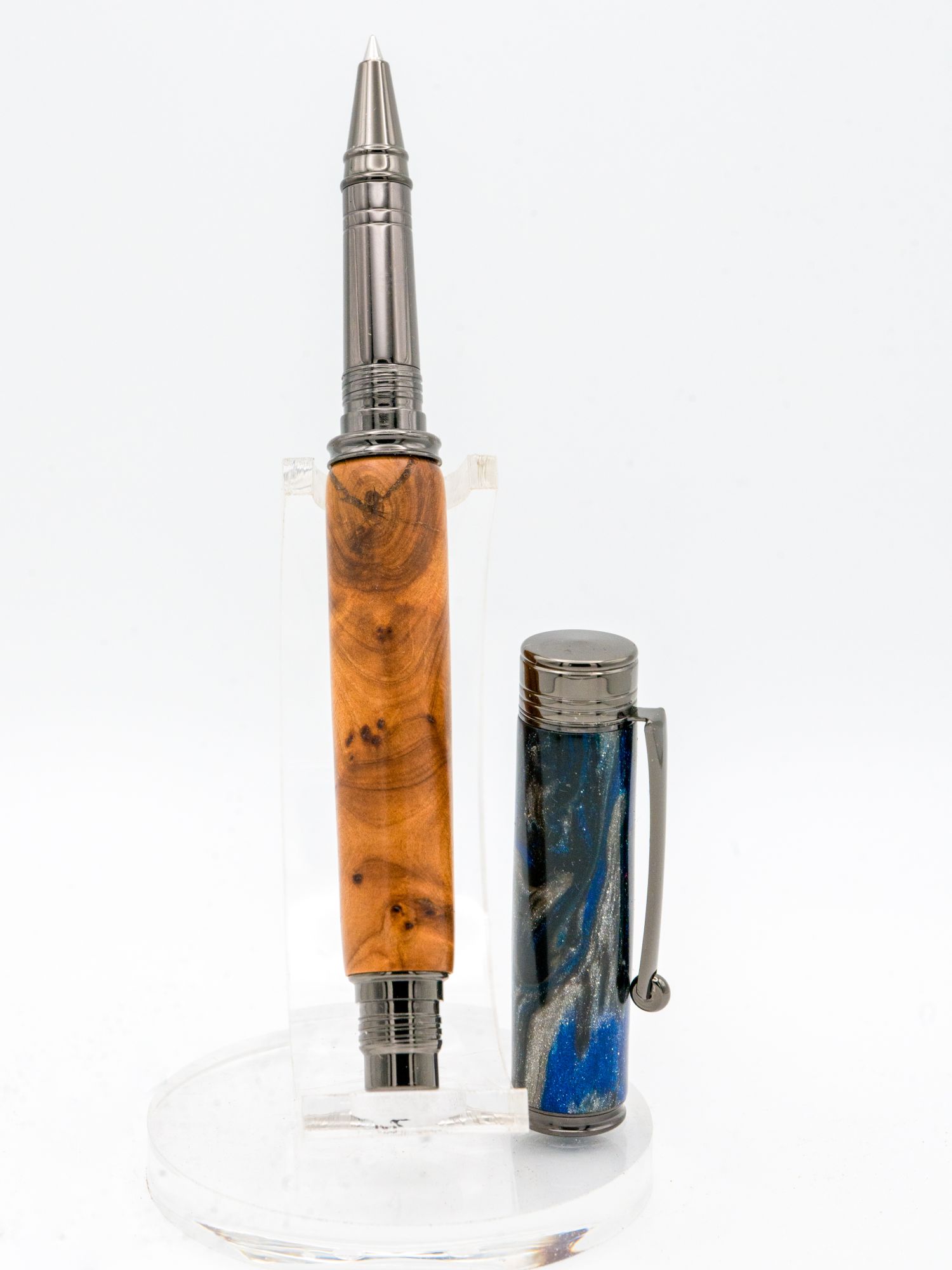 A stunning writing instrument hand-turned to showcase exceptional natural beauty and modern craftsmanship. This rollerball pen features a mesmerising barrel crafted from stabilised pippy yew paired with shimmering DiamondCast resin, creating a striking contrast between organic wood and contemporary materials that results in a truly one-of-a-kind piece.